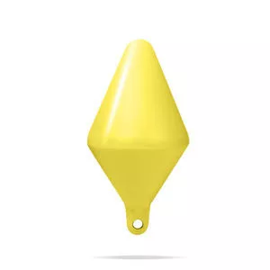 Doppelkegelförmige (Double-Cone) Markierungsboje aus starrem Kunststoff, mit Haken, in der Farbe Gelb.