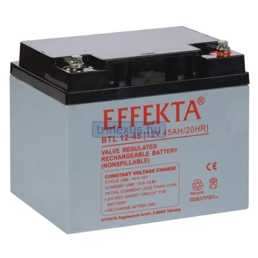 12 VDC45 AhAbmessungen: 198 x 166 x 170 mmGewicht: 13,2 kgDetaillierte Daten und Parameter finden Sie auf der Startseite der Effekta-Batterien!http://www.trinexus.hu/termekek/Effekta#bemutatas