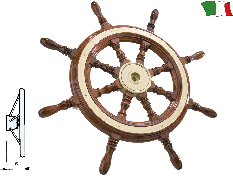 Klassisches Steuerrad aus Hartholz, gefärbt, mit Kupfernabe und Ring.