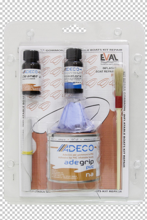 Zweikomponentenkleber für PVC-Schlauchboote. Im Set enthalten: 1 Reparaturmaterial (10 cm kreisförmig), 1 Kleber 125 ml, 1 Flasche Aktivator 10 ml, 1 Flasche Reinigungsflüssigkeit 10 ml, Pinsel. Gebrauchsanweisung: Reinigen Sie zunächst die zu verklebende Fläche mit dem „Cleaner 26“. „Reinigungsflüssigkeit mit einem weichen Tuch abwischen. Mischen Sie die Aushärtungsflüssigkeit „Aktivator“ (Komponente A) mit dem Klebstoff „Adegrip“ (Komponente B) zu 8–10 %. Also z.B. Für 10 ml Adegrip 1 ml Aktivator mischen. Die Verklebung muss innerhalb von 30 Minuten erfolgen, da die Mischung danach ihre Wirkung nicht mehr ausreichend entfaltet. Tragen Sie die resultierende Mischung auf beide Oberflächen auf (diejenige, die Sie kleben möchten, und das Flickmaterial in der Verpackung) und warten Sie 20 Minuten, bis der Kleber in die Materialien eingedrungen ist. Anschließend drücken Sie die beiden Flächen mit einer Hand fest aneinander, legen die andere Hand auf die andere Seite der Fläche, um das Material zu erwärmen – oder nutzen Sie eine Infrarotlampe oder einen Fön. Dies sollte mindestens 15 Minuten lang zusammengehalten werden. Zum Schluss drücken Sie die Klebefläche mit zwei Klammern zusammen und belassen diesen Verband 72 Stunden lang.