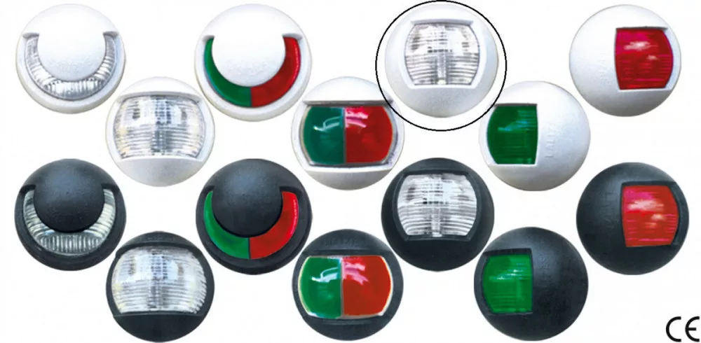 Standard-Navigationslicht, im Bild mit einem Kreis markiert, bis zu 12 Meter lang. Das Haus ist weiß. Lichtprojektionswinkel: 135 Grad. Spannung: 12 Volt.