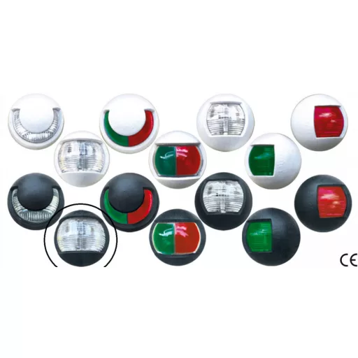 Standardmäßiges weißes Navigationslicht, im Bild mit einem Ring markiert, bis zu 12 Meter lang. Gehäusefarbe: weiß. Lichtprojektionswinkel: 225 Grad. Spannung: 12 Volt.