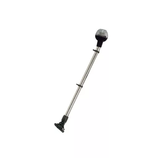 Runde Leuchte mit weißem Licht, montiert auf einem neigbaren Stahlstab, in einem schwarzen Kunststoffgehäuse, mit Fahnenbefestigungsösen. 12V / 10W, hat 360-Grad-Sichtbarkeit.