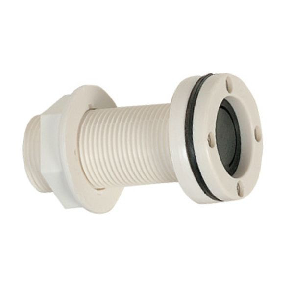 Ein Beifahrer-Wasserauslass aus weißem Kunststoff und ausgestattet mit einer Gummimembran, um einen Rückfluss zu verhindern. Länge 90 mm, Durchmesser 33 mm.