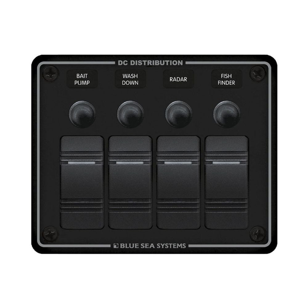 Vízálló rögzítőtömítéssel ellátott, kompakt kapcsolótábla. Minden kapcsoló beépített LED-del rendelkezik, amely jelzi a bekapcsolt állapotot. Függőlegesen vagy vízszintesen is felszerelhető, kis méretű címkekészlettel együtt szállítva.