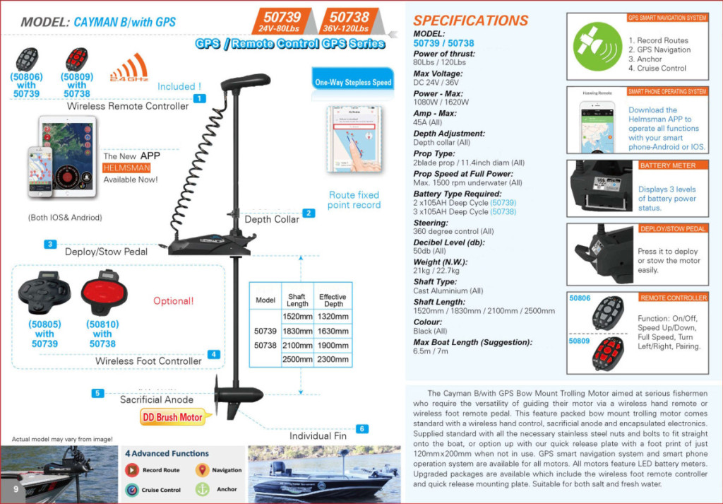 Der CAYMAN-B GPS kann sowohl in Süß- als auch in Salzwasser eingesetzt werden und wird mit einer zweijährigen Werksgarantie geliefert. Die Schubkraft von 80 Pfund ermöglicht es Ihnen, mit einer einzigen Deep-Cycle-Batterie einen ganzen Tag lang Boot zu fahren.