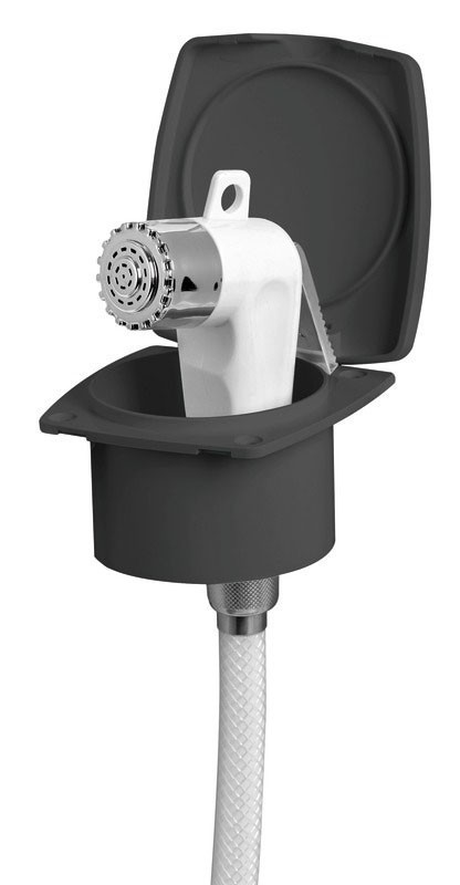 Zuhanytartó doboz benne 4 m hosszú, fehér zuhanycső, rajta, krómozott fejjel ellátott műanyag zuhanyfej, UV-álló.